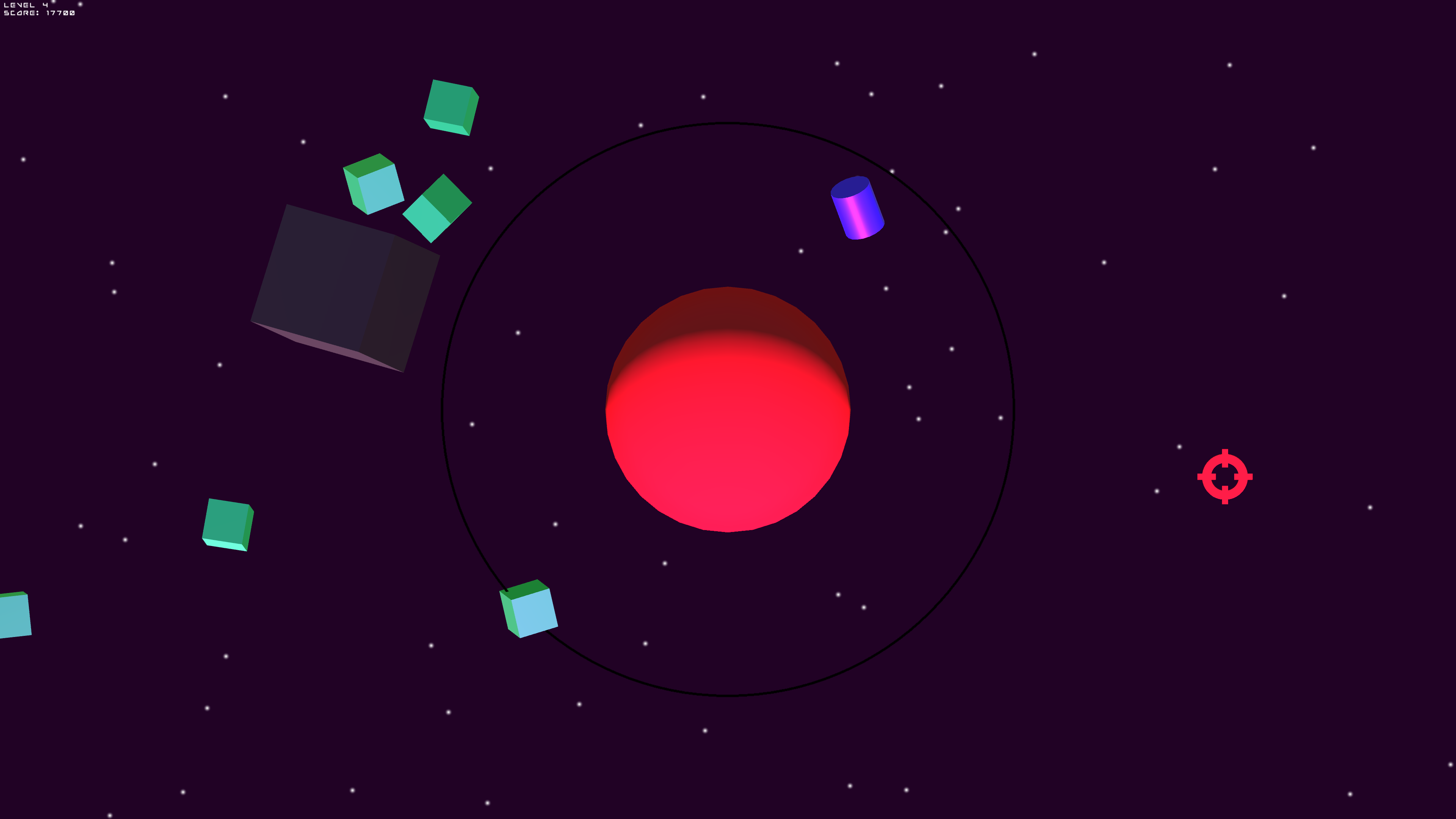 This game allows you to shoot down the various 3D shapes coming at you from every direction, the more shapes you hit, the larger you become. This increases the challenge because a larger radius means less reaction time to destroy enemies. Getting hit or missing shots results in a decrease in size. The level is finished when the player reaches a certain size.