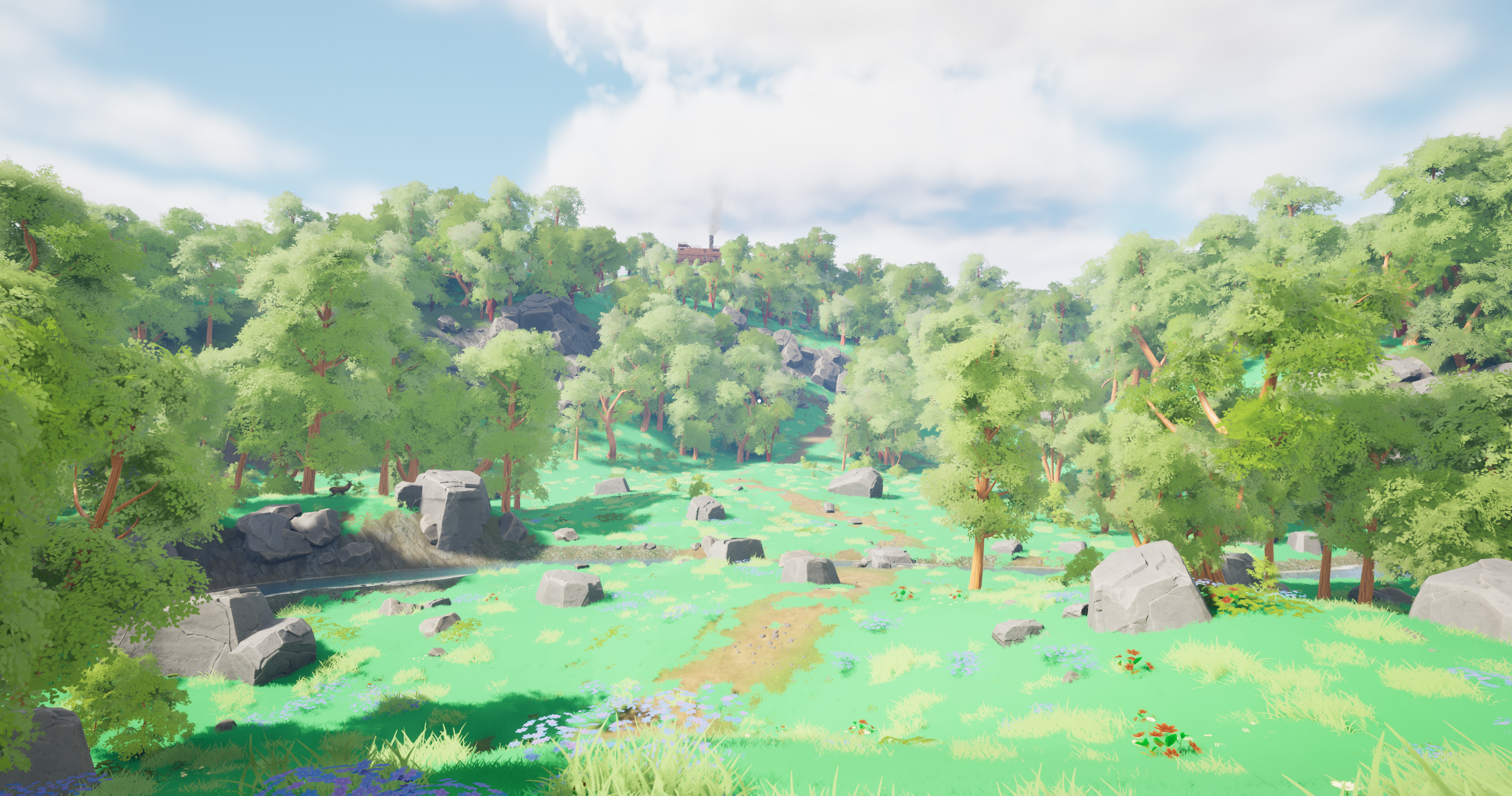 One of the starting sections of the game. You can see a randomly spawned deer walking towards the left of the frame. I was extremely considerate of tree placement to ensure the cabin on the hill was fully visible.